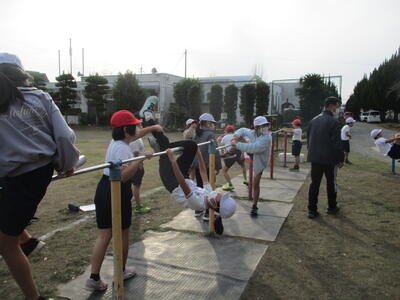 今日(10月6日)は、補助倒立前転に挑戦する日でした。教育事務所や教育委員会の先生、木倉小の先生方とたくさんの先生方のいらっしゃる中で、5年生の子どもたちはいつも通りにマット運動を笑顔で楽しみ、いろいろな発見を友達同士で出し合いました。
