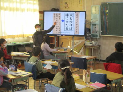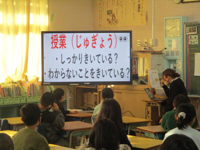 入学して1年近く、1年生の子どもたちがいつものように張り切って授業に参加していました。担任の先生の話を聞くときの姿勢や目の輝き、まっすぐにあげられた手など、1年間の成長を感じさせる授業でした。
