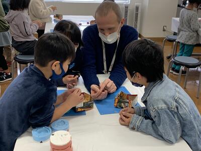 作ってるおもちゃは「ぴょんコツプ」「とことこ車」「パッチンジャンプ」「ころころころん」「ヨットカー」などなどです。作ってみて自分たちで実際に動かしたり遊んだりしてさらに改良していきます。たのしいおもちゃを作っている子ども達の目は生き生きとしていました。