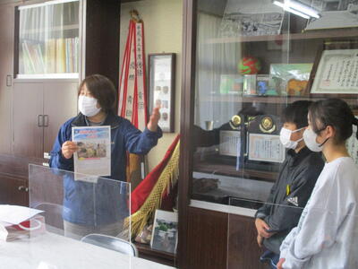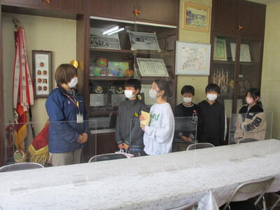 町探検では、「門前川めがね橋」では社会教育課の上坂さんの分かりやすい説明を受け、たくさん質問しました。「城山公園」では同じく社会教育課の園村さんから、「街中ギャラリー」では街中ギャラリーの緒方さんから説明を受けました。