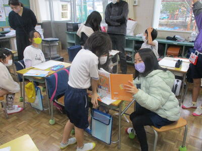 「I go to school」、「What time is it?」、「I get up at 8 o’clock」などの英語が教室中に飛び交っていました。ペア学習では分からないときはペアの友達が優しく教えてくれていましたし、両方分からないときは英語専科の先生にどんどん聞いて学んでいました。