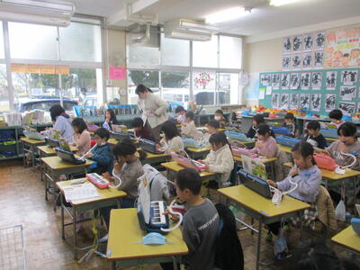 コロナが落ち着き、2年生の教室からは鍵盤ハーモニカの軽快なメロディーが流れてきました。2年生の教室に入ると、子ども達が一斉に「子ぎつね」を鍵盤ハーモニカで合奏していました。