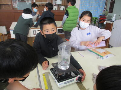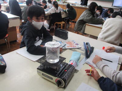 4年生の理科は「すがたを変える水」を学習しています。この日はグループごとにガスコンロでビーカーの水をあたためて沸騰させたり、出てきた泡をビニール袋に集めたりする実験をしました。