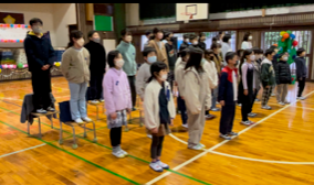 新運営委員会が考えた全校で行うレクレーションの1つ目は進化ジャンケンの身体ジャンケンバージョンでした。まず、運営委員会がやり方を実際にやって説明し、全校でスタートしました。ペンギン→ニワトリ→カンガルー→ゴリラ→人間と全身でジャンケンをしながら進化していき、運動場には笑顔が溢れました。2つ目のレクレーションは○×クイズでした。クイズの中には6年生が1年生の時の問題もあり、1年時担任の先生の懐かしい話があったり、6年担任の先生の誕生日に6年生がサプライズでやった話があったりととても温かなゲームになりました。