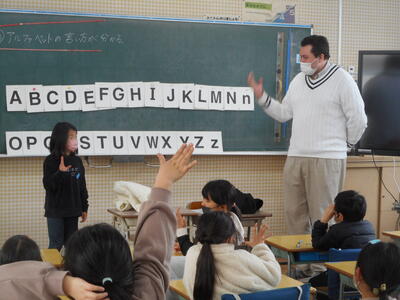 御船町では低学年から外国語活動の時間があります。1、2年生もALTのクリス先生をお招きして、担任の先生とのTT(ティームティーチング)で英語を楽しく学習しています。