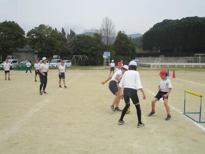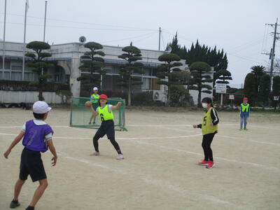 4年生最後の体育の種目はハンドボールです。運動場に2つのコートを引き、広いコートで子ども達は伸び伸びとハンドボールを楽しんでいました。
