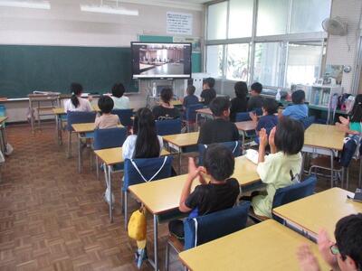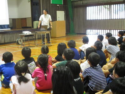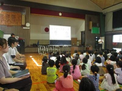 御船警察署員の方を講師にお招きして、道路での安全な通行や自転車の乗り方を学ぶため、全校で交通教室を行いました。この日は、天候不良で運動場が使えなかったため、体育館で交通安全のDVD視聴し、全児童を対象に、道路や横断歩道での気をつけることなどを分かりやすく話していただきました。本校は、交通事故0(ゼロ)を目指しています。