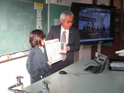 米増孝博様のご紹介をします。今回、熊本県教育委員会から、熊本県家庭教育功労者として、これまでの功績として表彰を受けられました。米増様は、地域並びに本校の教育活動に長年にわたりご尽力いただきました。特に、木倉小学校での放課後子ども教室では、この活動に参加している3年生から6年生までの児童に対し、地域の方々と一体となり、ご指導ご支援を賜りました。心より御礼を申し上げます。ありがとうございました。そして、おめでとうございます。