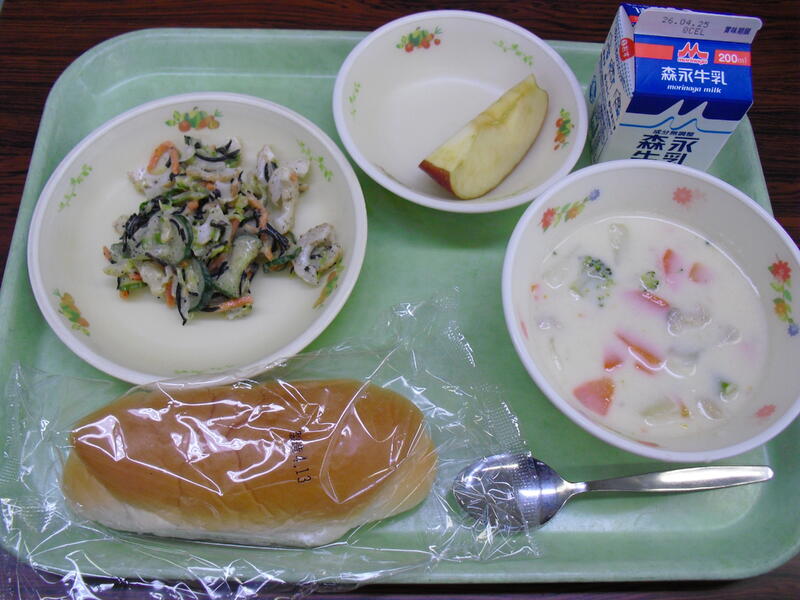 今日のメニュー:ミルクパン、クリームシチュー、ひじきのマヨサラダ、りんご