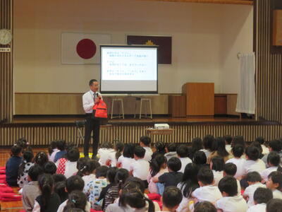 校長先生から「 ふるさと 夢 なかま」について話があり、子どもたちは、熱心に聞いていました。