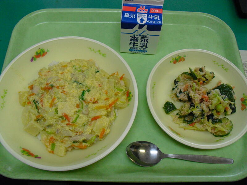 今日のメニュー:親子丼、わかめとツナのごまサラダ、牛乳