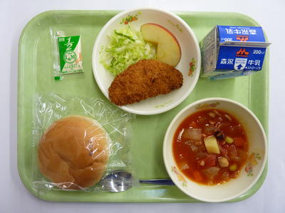 「ポークビーンズ」はポーク(豚肉)とビーンズ(豆)の煮込み料理です。アメリカでは人気の庶民の料理です。トマト味でみなさんにも食べやすい味付けになっています。「ほうれん草サラダ」に使ってあるほうれん草は、寒い冬が旬で栄養価も高くなります。ほうれん草の栄養は風邪などの病気から守ってくれる働きがあります。