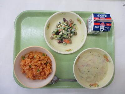 4種類の豆を入れたビーンズサラダです。豆と一緒に野菜やチーズを入れてマヨネーズであえました。乳製品のチーズを一緒に入れることで、カルシウムやビタミン類がたくさんとれるサラダになっています。給食では、日本人に不足しがちな乳製品をいろいろな形で献立に取り入れています。