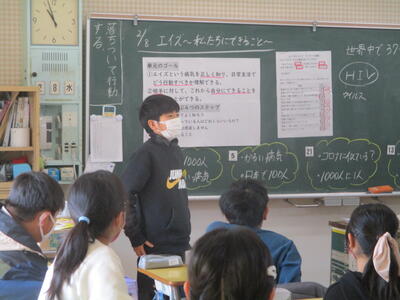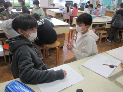 この日、5年生の教室では総合的な学習の時間に学んできたこと振り返りをしていました。5年生では「稲作体験学習」「水俣病学習」「環境学習」等、多くの学習を行ってきました。