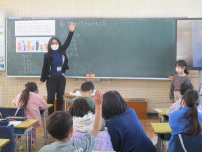 御船町では低学年から外国語活動の時間があります。1、2年生もALTのクリス先生をお招きして、担任の先生とのTT(ティームティーチング)で英語を楽しく学習しています。