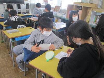 3年生の教室では、総合的な学習の時間に2月に行った町探検のことを思い出し、グループで壁新聞にまとめていました。