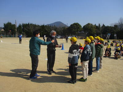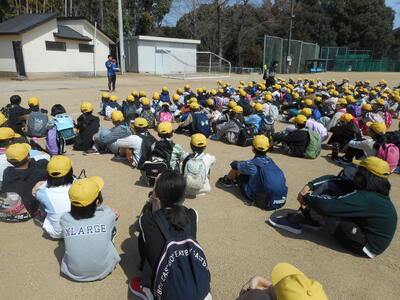 温かい日差しの中、全校で交通教室を行いました。自転車の安全な乗り方を学ぶため、教室でのDVD視聴をしました。また、運動場に仮設道路引き、安全な歩行の仕方についての学習をしました。 御船警察署員の方を講師にお招きして、全児童を対象に、道路や横断歩道での気をつけることなどを分かりやすく話していただきました。
