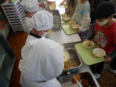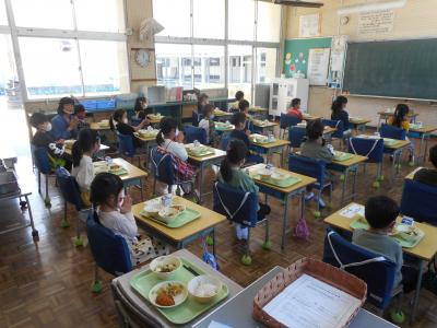 先週から給食が始まりました。1年生にとっては、初めての給食当番です。最初はなかなか上手くできませんでしたが、1週間後の今日(4月19日)は、1年生だけで配膳ができるようになりました。