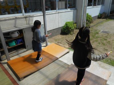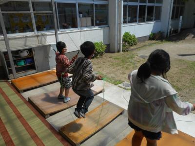 その一つが、低学年教室のすぐ前にある「ジャンピングボード(なわ跳び練習板)」です。教室の目の前に設置しているので、休み時間になると上靴のまますぐにできます。