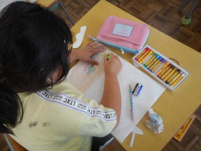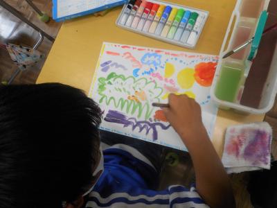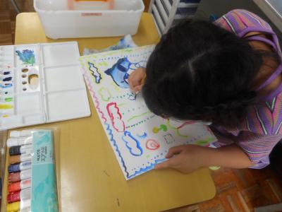 今日(5月10日)は、絵の具の混ぜ方や、塗り方を学んだあと、自分で書いた似顔絵の色塗りをしました。しっかりと特徴を捉えて熱心に書くことができました。