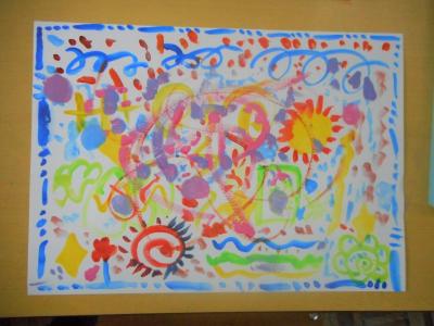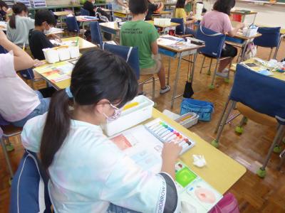 今日(13日)、3年生は図工の時間に「絵の具と水のハーモニー」をしました。子どもたちは、筆の使い方や絵の具の混ぜ方などを学んだあと、それぞれが点や線を思い思いに組み合わせて描き楽しみながら表現していました。