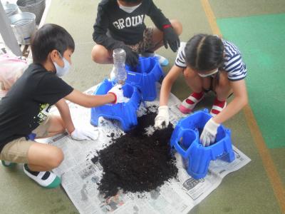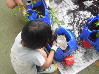 今日(18日)、2年生は生活科の時間に「やさいのうえつけ」で、トマトの苗を一人一鉢に心をこめて植えました。