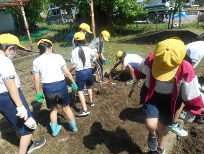 昨日(19日)、4年生は教室横にある学級園を耕しました。子どもたちは、うねの立て方や肥料を使う理由などを学んだあと、汚れることも気にせずに一生懸命に取り組みました。
