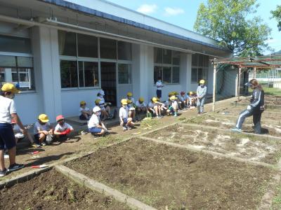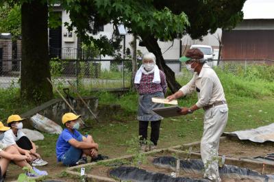 今日(19日)、1・2年生は生活科の時間に、ゲストティーチャーの福島さんに教えていただきながらトマトやきゅうりなどの夏野菜の苗を植えました。
