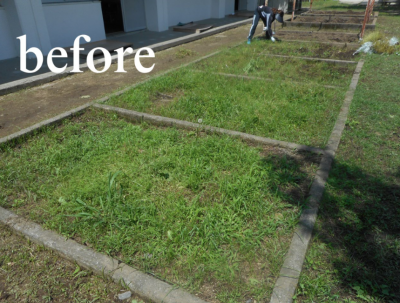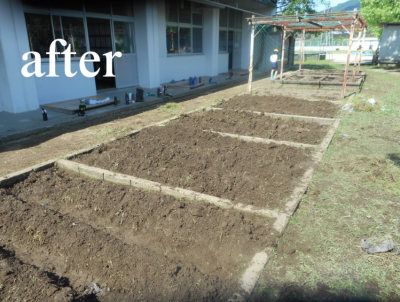 写真の3・4枚目は、beforeとafterです。雑草を取り除きうねの形をしっかりと作ることができました。この後、理科の学習で使うゴーヤ、オクラを植える予定です。
