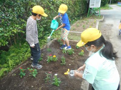 子どもたちは、土の入れ方や苗の植え方を学んだあと、丁寧に楽しみながら活動していました。