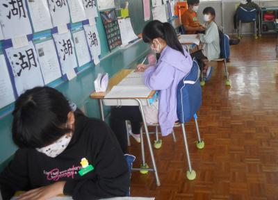 今日(21日)、3年生と4年生は書写の時間に「毛筆」の学習をしました。