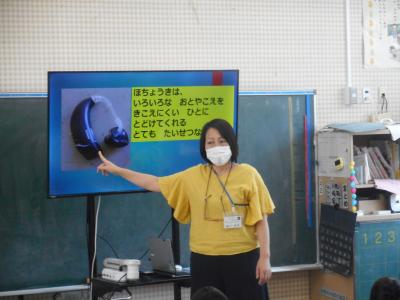 今日(31日)、1年生はりんどう学級の担任の樋口教諭からりんどう学級についてのお話を聞きました。授業では、難聴学級のことや学校での生活の仕方などの説明を聞きました。