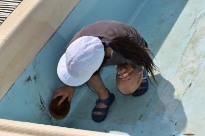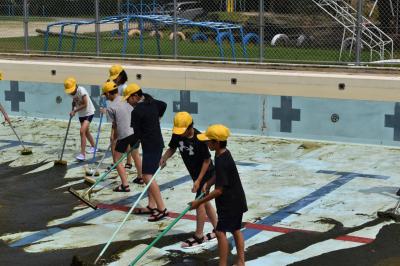 今日(8日)は晴天の下、全校児童でプール掃除を行いました。1年近く溜まった汚れを、デッキブラシやたわしで丁寧に落としました。