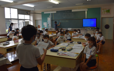今日(28日)、1・2年生は生活科の時間に、ゲストティーチャーの福島さんに教えていただきながら芋の苗を植えました。