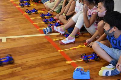 昨日(2日)は、学習のまとめとして、理科室で回路の最終確認をしたあと、体育館で完成したモーターカーを実際に走らせました。直列つなぎと並列つなぎのつなぎ方でモーターカーの速さが違うことに気づいていました。子どもたちは、友達と協力しながら楽しく取り組むことができました。