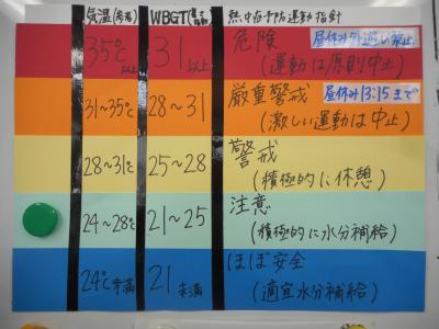 木倉小では、熱中症予防として昼休みの時間の過ごし方を、その日のWBGT値によって決定しています。 ※WBGT値とは、人体と外気との熱バランスに影響の大きい気温、湿気、輻射熱(地面などの周りからの熱)の3つを考慮した指数です。