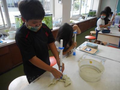 今日(23日)、4年生は理科「とじこめた空気と水」の授業をしました。授業では、大きい注射器に空気と水を入れ、押してみるとどのような変化があるか予想をしたあと、実験をしました。