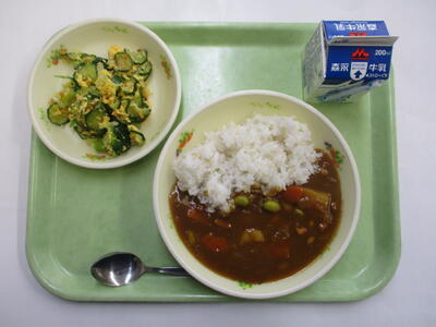 ハヤシライス、牛乳、コロコロビーンズサラダ