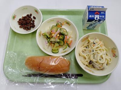 ミルクパン、牛乳、クリームスパゲッティ、フレンチサラダ、ココア豆