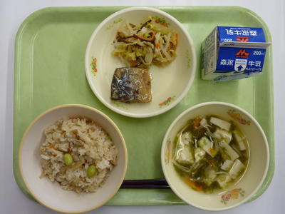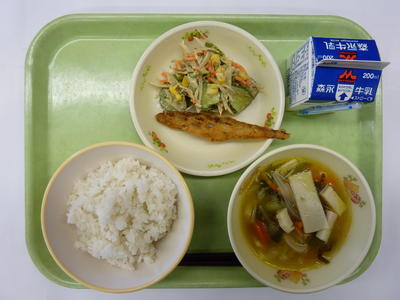 大根飯、昆布和え、アオサ汁、サバのゴマ味噌煮、牛乳