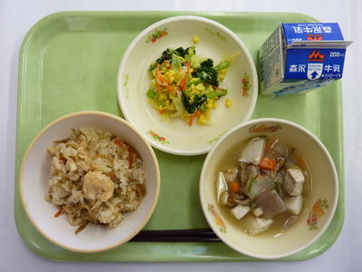 鯛めし、のっぺい汁、小松菜とたまごのサラダ、牛乳