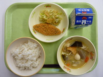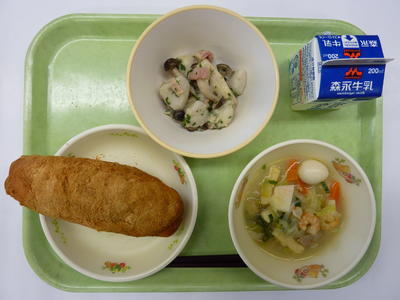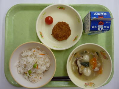 白玉汁、レンコンはさみフライ、ミニトマト、生姜ご飯、牛乳