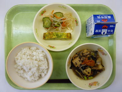 磯煮、ほうれん草のだし巻き卵、もやしのナムル、牛乳