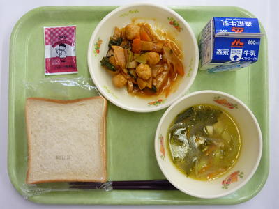 チンゲンサイの中華スープ、つくねのケチャプソースがらめ、食パン、マーシャルビーンズ、牛乳