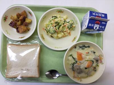 卵サラダをパンにはさんでサンドイッチにして食べましょう。また、今日は冬野菜がたっぷり入ったクリーム煮とおやつにもおすすめなキャラメルポテトで旬の食材の栄養がたくさんとれる給食です。今が旬の食材はどんなものがあるか、どんな歯ごたえやおいしさがあるか、食べながら確認してみてください。
