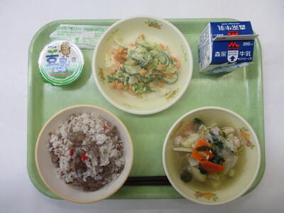 今日は野菜たっぷりのスープとクルトンがアクセントになったシーザーサラダ、お肉とバターライスとの相性が抜群なビーフライス、締めのデザートは豆乳ムースとちょっぴりおしゃれで華やかな給食です。味わって食べてください。