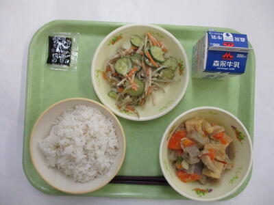 今日は「図書の本とのコラボメニュー」です。みなさんは「サラダで元気」という本を読んだことがありますか?以前は小学1年生の国語の教科書に載っていましたが、病気のお母さんのためにりっちゃんが動物たちに手伝ってもらいながらサラダを作るお話です。みなさんもりっちゃんが考えたサラダを食べて元気に過ごしてください。