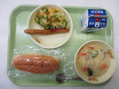 今日はセルフドッグです。自分で、ウインナーやサラダをパンにはさんでホットドッグにして食べてくださいね。また、今日のシチューには白いんげん豆が入っています。豆はたんぱく質を多く含む赤の仲間の食材です。赤の仲間の食材はみなさんの血や肉や骨などをつくる食べ物です。しっかり食べてください。