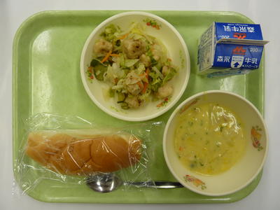 カボチャのクリームスープ、甘酢サラダ、ミルクパン、牛乳