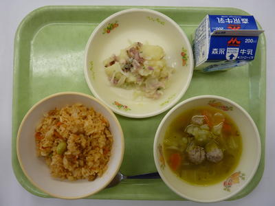 ジャーマンポテト、キャベツとミートボールのスープ、チキンライス、牛乳